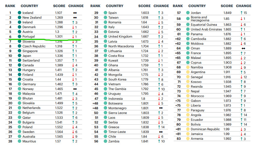 Finalmente, Portugal é conhecido por ser um país seguro e amigável, e ocupa em 2023 o 6º lugar de país mais seguro do mundo, ou seja, muito acima dos Estados Unidos e realmente em Portugal você sente-se seguro, desde andar com o celular à vontade nas ruas, passear com sua família na rua, etc, sempre lembro que um país seguro, não é o mesmo que ausência a 100% de problemas, claroque Portugal tem caos pontuais e é necessário alguns cuidados em determinadas regiões consideradas abaixo da média dos padrões de segurança nacional, mas comparando com outros países é um “paraíso” e por isso o merecido 6º lugar na tabela: